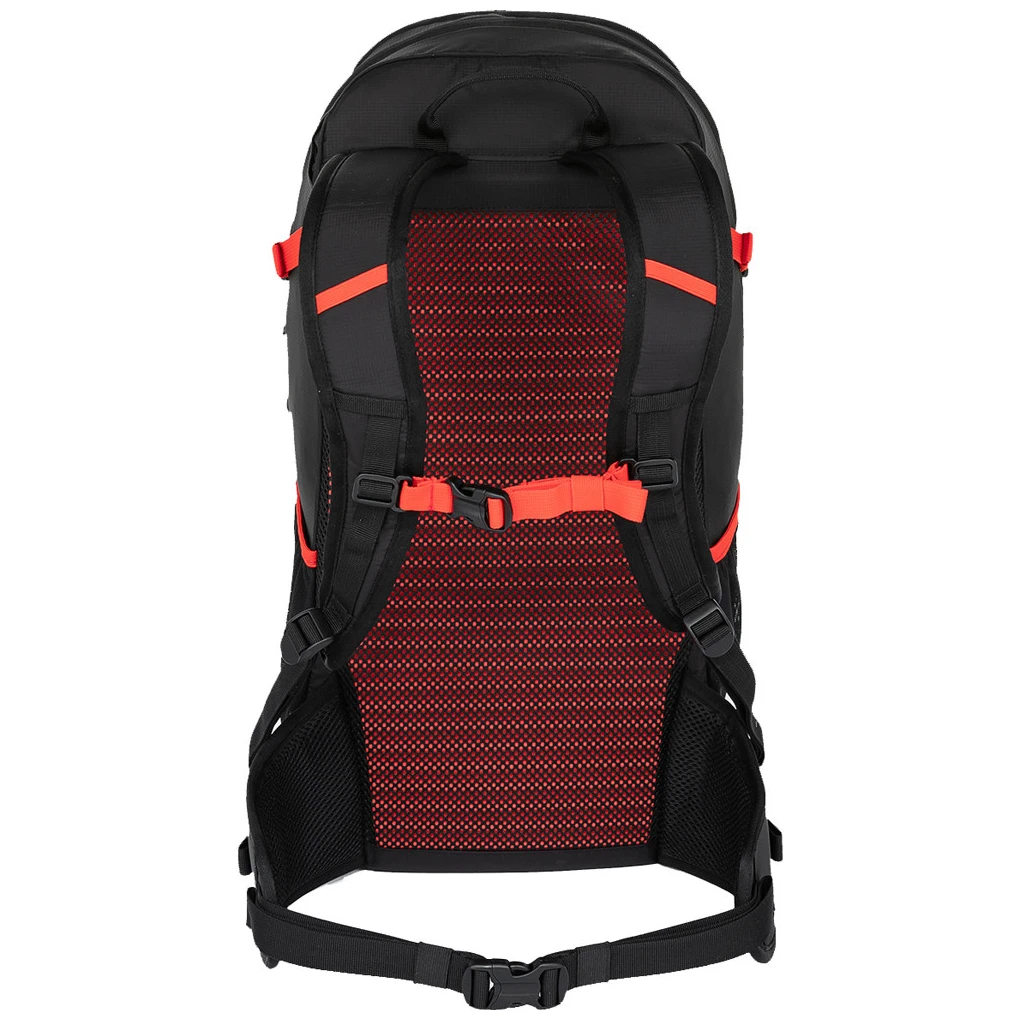 Plecak jest wykonany z wytrzymałej tkaniny Rip Stop, która minimalizuje ryzyko przetarcia lub rozerwania i gwarantuje długą żywotność. O wygodne noszenie dba solidny system nośny SBS, który jednocześnie chroni zawartość plecaka. Anatomicznie ukształtowane szelki, pas biodrowy, pas piersiowy i boczne paski kompresyjne pomagają prawidłowo rozłożyć ciężar i zapewniają stabilność nawet w trudnym terenie.