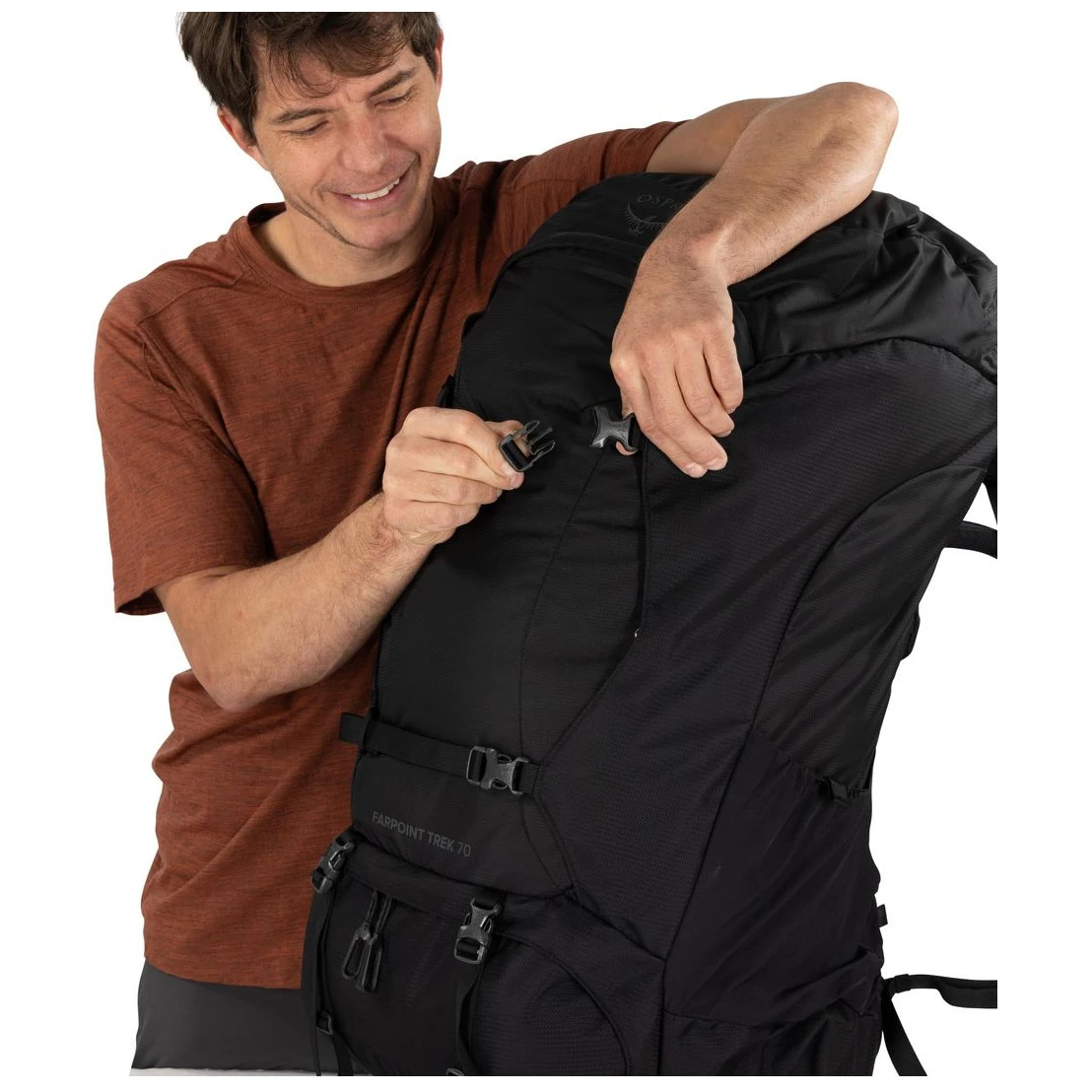 Plecak oferuje duży przedni dostęp do komory głównej, dolny dostęp z zamkiem błyskawicznym i przegrodą rozdzielającą, wewnętrzne pasy kompresyjne oraz przednie paski kompresyjne do stabilizacji ładunku. Nie brakuje górnej kieszeni na drobiazgi, dużej kieszeni na przednim panelu z pionowym zamkiem, dwóch kieszeni na pasie biodrowym zapinanych na zamek, wielofunkcyjnej wewnętrznej przegrody na bukłak lub laptop i wyściełanych uchwytów górnych i bocznych. Dostępne są również uchwyty do mocowania plecaka Farpoint/Fairview Travel Daypack lub Daylite oraz odpinane paski do karimaty.