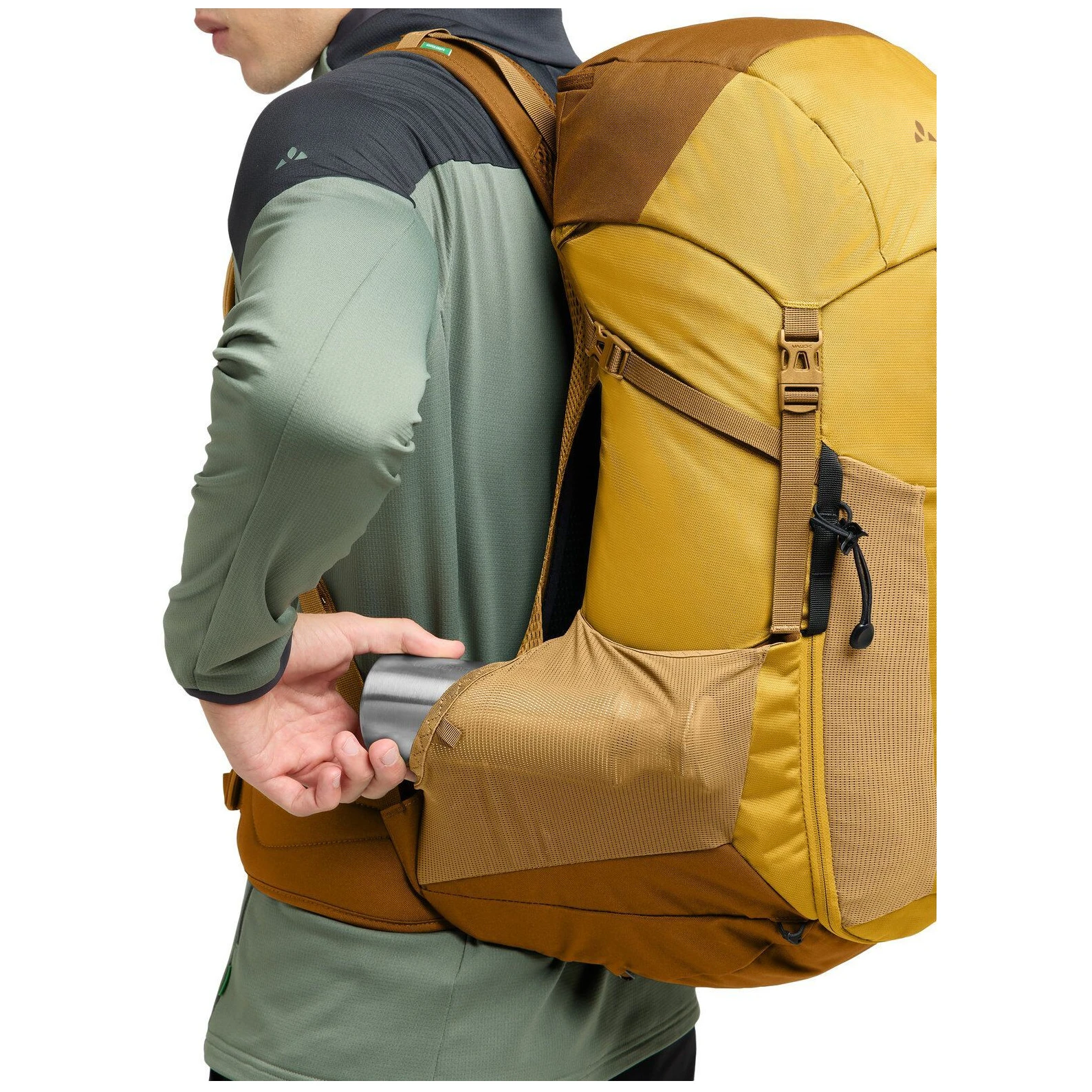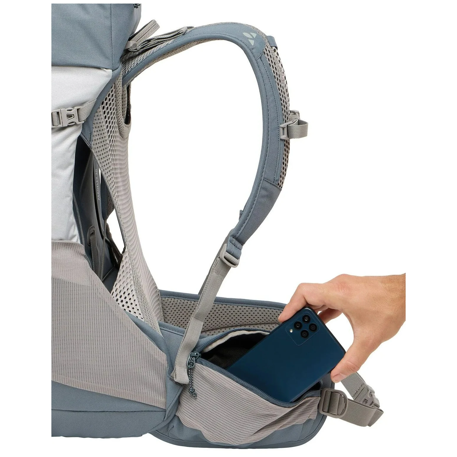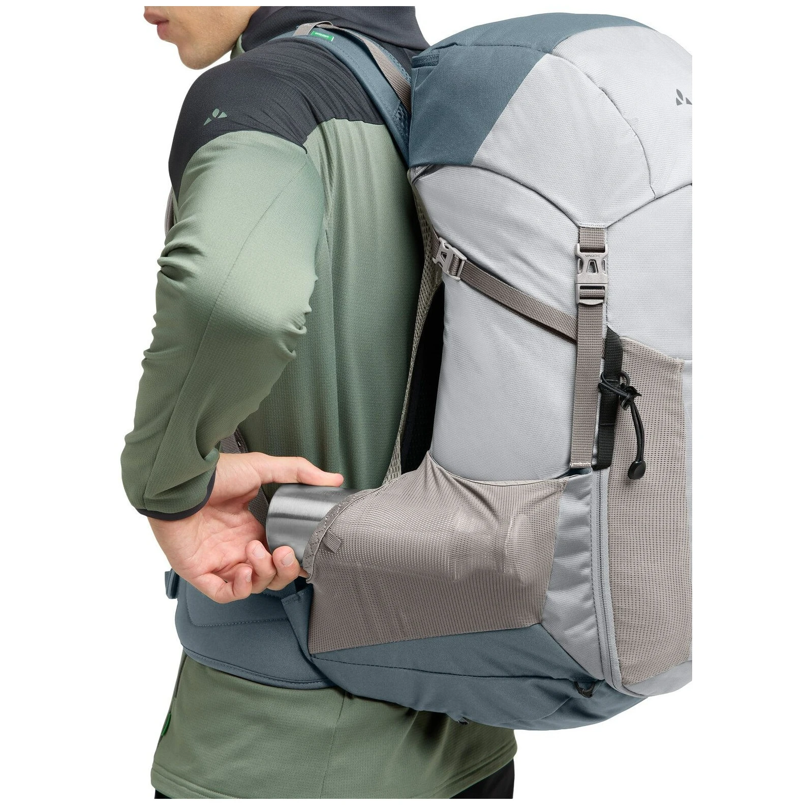 Pasy biodrowe z kieszenią na zamek błyskawiczny zapewniają stabilność i bezpieczne przenoszenie ładunku. Materiał Eco Finish jest odporny na wodę i zabrudzenia bez PFC i wykonany z recyklingowanego PET. Oznaczenie VAUDE Green Shape gwarantuje ekologiczną i funkcjonalną produkcję.