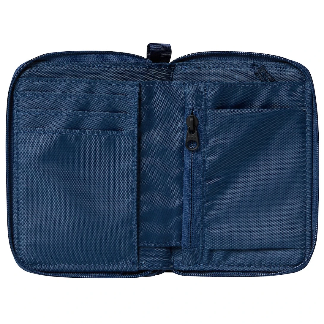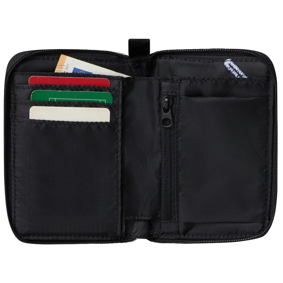 Wykonany jest z niezwykle wytrzymałego materiału pochodzącego z recyklingu. Wewnątrz znajdziesz wystarczająco dużo miejsca na banknoty, monety, karty płatnicze i dokumenty, a także miejsce na tag lokalizacyjny. Kieszenie są wystarczająco duże na wszystkie waluty.