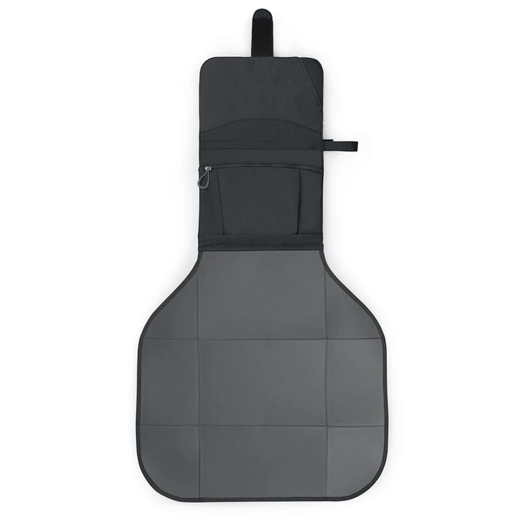 Podložka jest wyposażona w bezpieczne zapięcie, pasek na nadgarstek i uchwyt do przymocowania do wózka. Praktyczne wewnętrzne kieszenie pomieszczą chusteczki dla dzieci i pieluchy, a zewnętrzna kieszeń przyda się na drobiazgi, które musisz mieć pod ręką. Cały system łatwo się składa, dzięki czemu jest kompaktowy i dyskretny, ale jednocześnie zawsze gotowy do użycia.