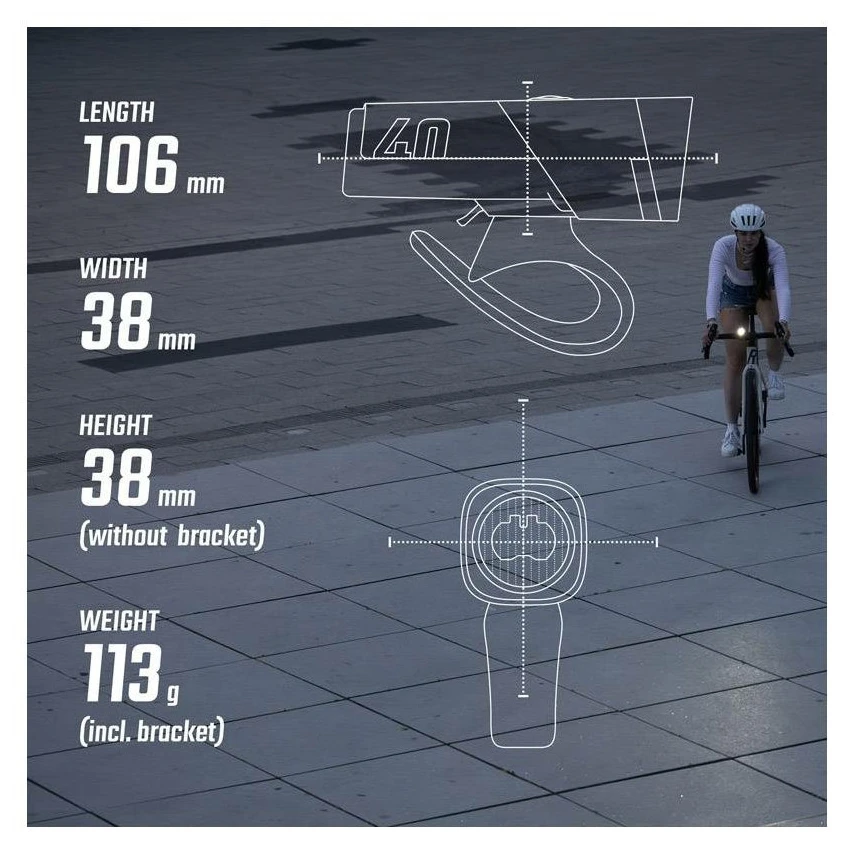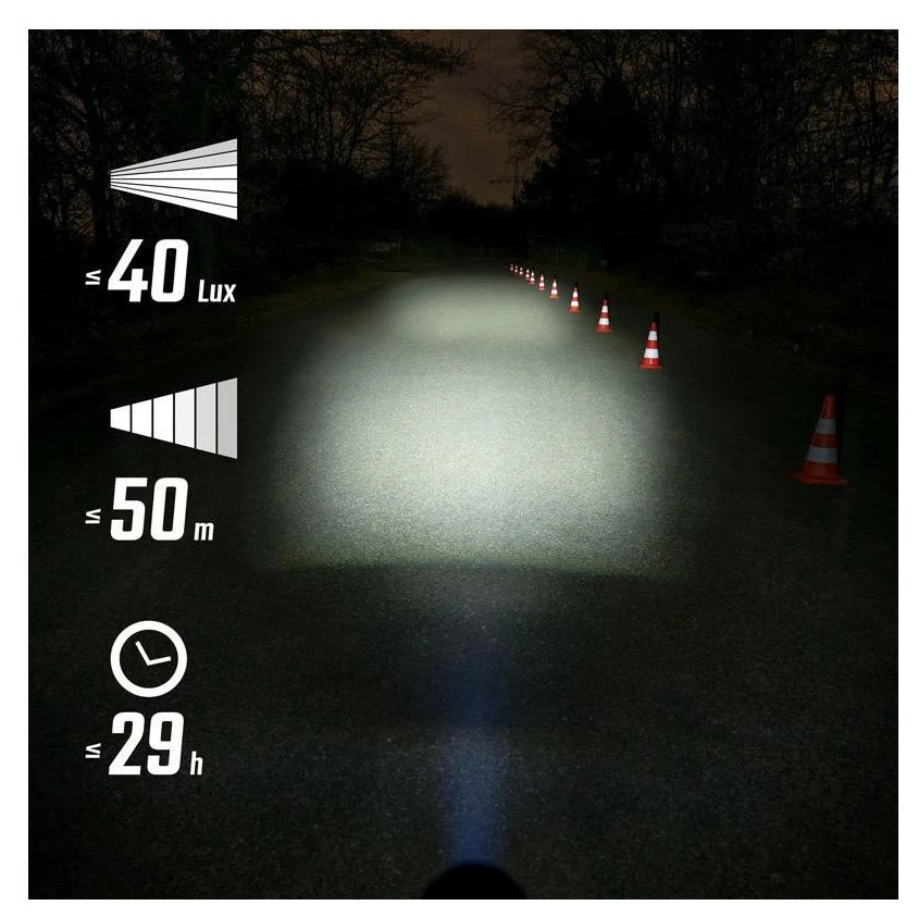 Światło oferuje natężenie 40 luksów, zasięg do 50 metrów i żywotność baterii do 29 godzin w trybie ekonomicznym. Dzięki wbudowanemu akumulatorowi z ładowaniem USB-C można go łatwo i szybko naładować, dzięki czemu jest zawsze gotowy do jazdy.