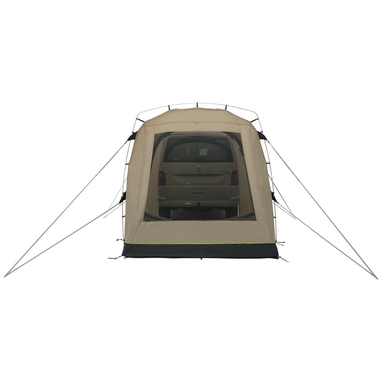 Do namiotu prowadzi główny, duży bezprogowy wjazd z moskitierą, który można wykorzystać również jako zadaszenie (drążki nie są częścią zestawu). Składane panele od strony samochodu zapewniają chroniony dostęp do wnętrza. Duże przyciemniane okno przepuszcza wystarczającą ilość światła, jednocześnie chroniąc przed promieniowaniem UV i zapewniając prywatność. Można je zasunąć zasłonką. Tylne drzwi pojazdu można otworzyć do środka, a system mocowania jednocześnie nie blokuje bocznych drzwi.
