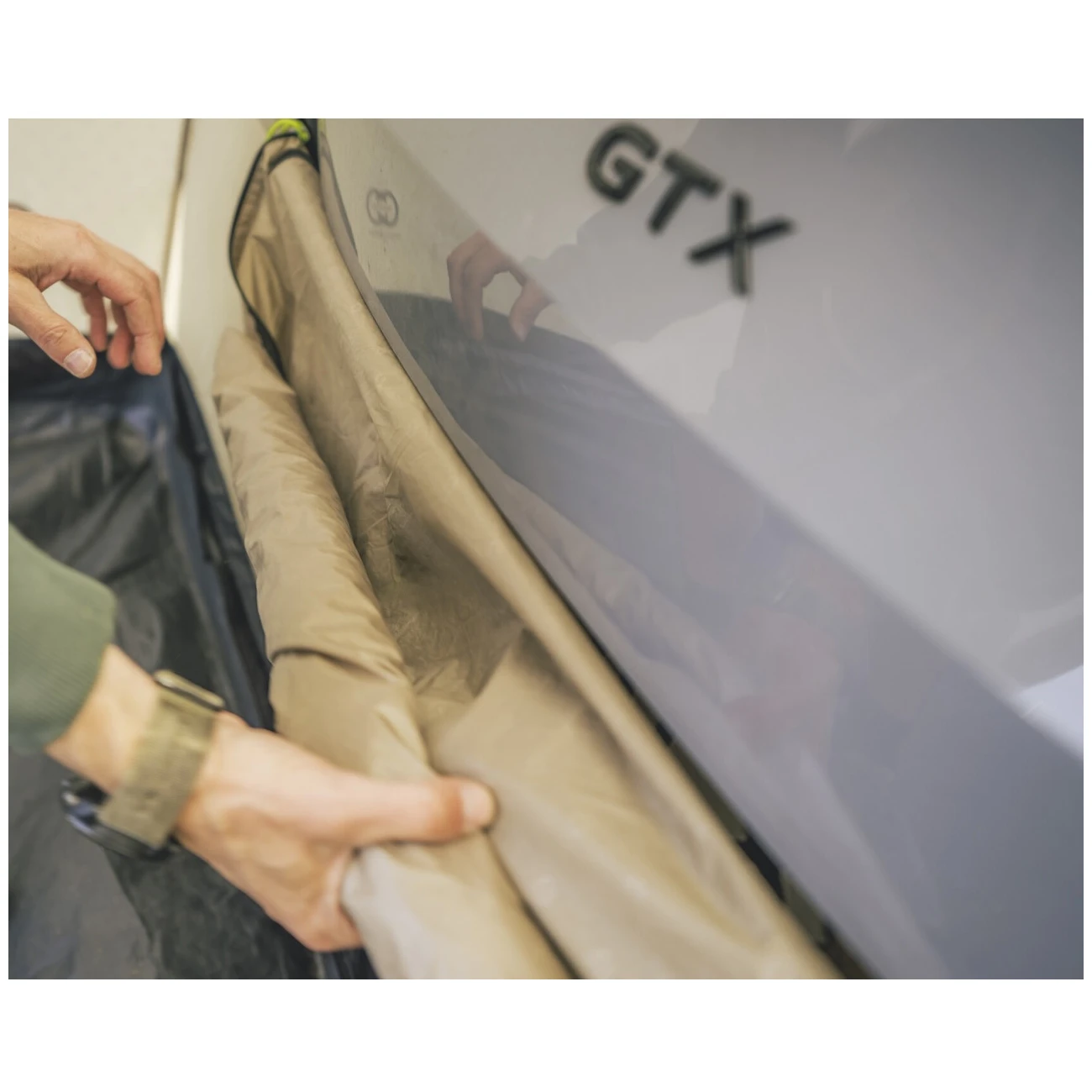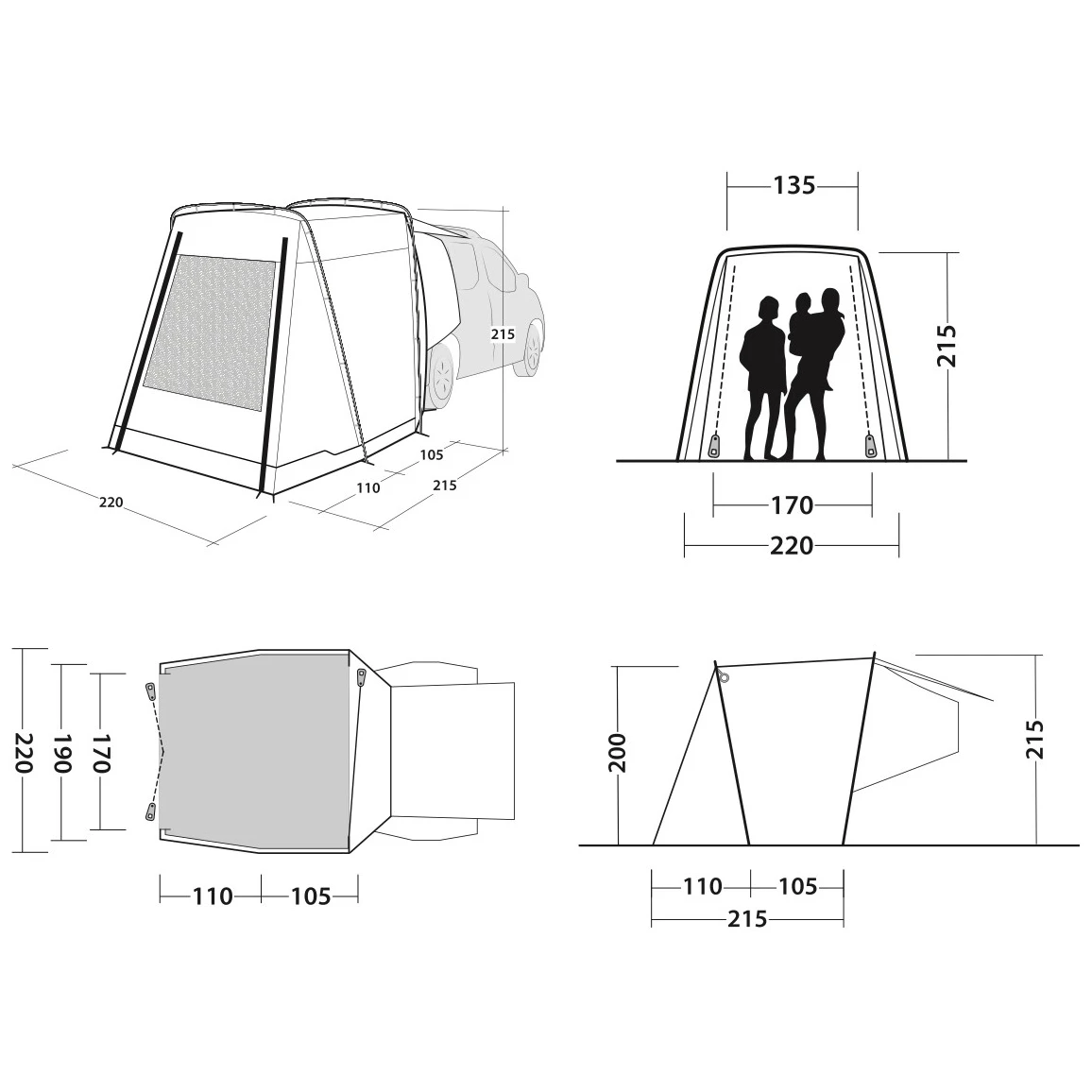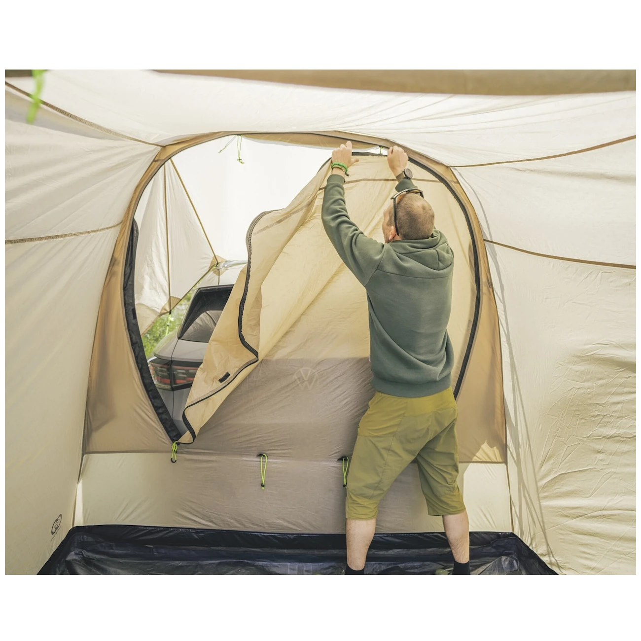 Do namiotu prowadzi główny, duży bezprogowy wjazd z moskitierą, który można wykorzystać również jako zadaszenie (drążki nie są częścią zestawu). Składane panele od strony samochodu zapewniają chroniony dostęp do wnętrza. Duże przyciemniane okno przepuszcza wystarczającą ilość światła, jednocześnie chroniąc przed promieniowaniem UV i zapewniając prywatność. Można je zasunąć zasłonką. Tylne drzwi pojazdu można otworzyć do środka, a system mocowania jednocześnie nie blokuje bocznych drzwi.
