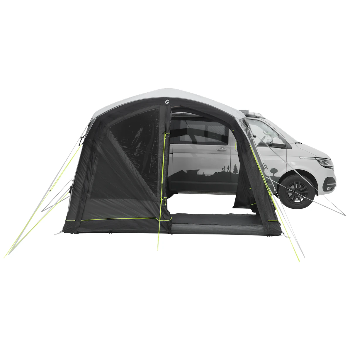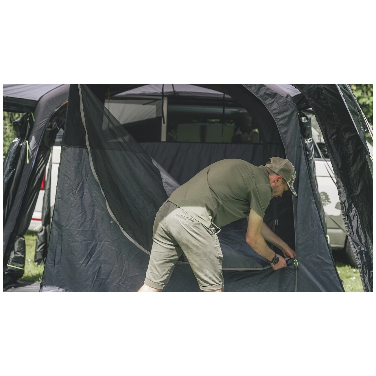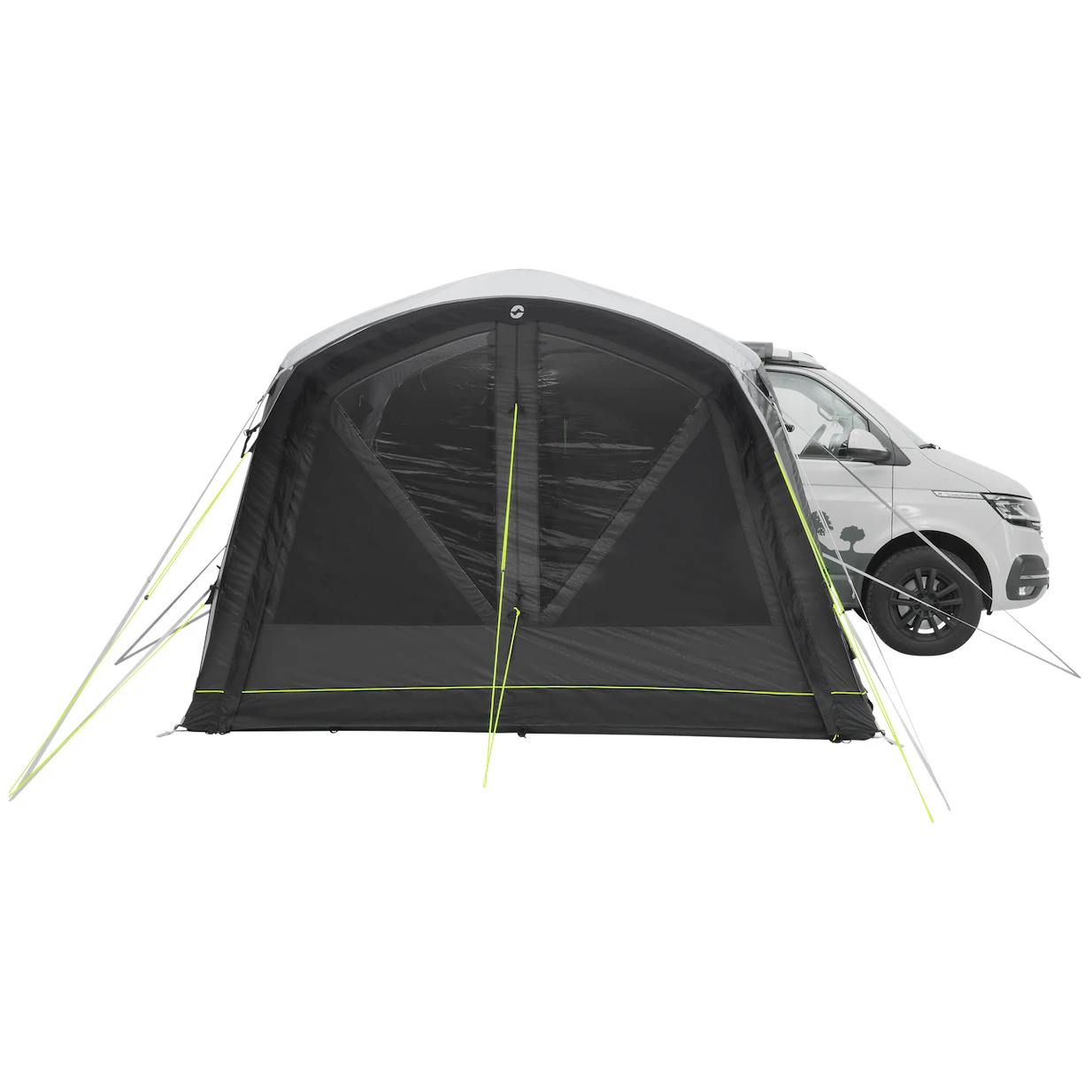 Do namiotu prowadzi główne, duże wejście bez progu z moskitierą. Można je całkowicie odsunąć na bok, aby nie przeszkadzało, lub otworzyć tylko od góry dla dodatkowej wentylacji. Pozostałe dwa wejścia boczne znajdujące się naprzeciwko siebie umożliwiają całkowite otwarcie namiotu. Duże przyciemniane szyby zapewniają dużo światła, ale także ochronę przed promieniowaniem UV i prywatność. Można je zaciągnąć zasłonami i zaciemnić przestrzeń dla lepszego snu.