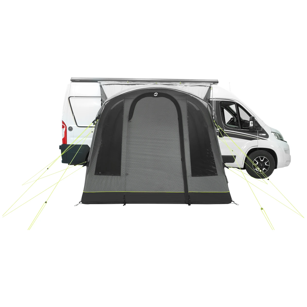 Główne wejście do namiotu ma duże wejście przystosowane dla wózków inwalidzkich z moskitierą i baldachimem. Można go całkowicie złożyć na bok, aby nie zwisał. Pozostałe dwa boczne wejścia naprzeciwko siebie znajdują się po stronie samochodu. Duże przyciemniane szyby zapewniają dużo światła, ale także ochronę przed promieniowaniem UV i prywatność. Można je zaciągnąć zasłonami.