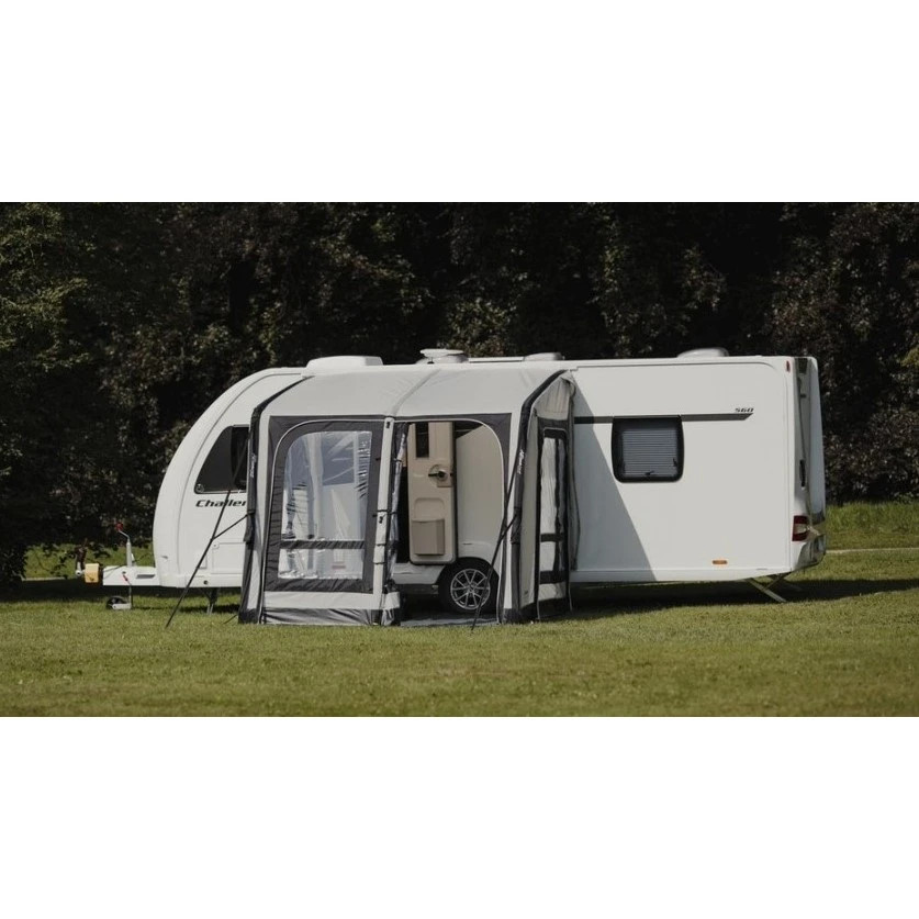Kompaktowy nadmuchiwany namiot Balletto Air 260 tej marki Vango to idealny wybór dla par lub młodych rodzin wybierających się na przygodę w przyczepie kempingowej. Istnieją 2 wejścia boczne i 2 wejścia frontowe z przodu domu. Wejścia mogą być używane do wentylacji i są dostępne dla wózków inwalidzkich. Wejścia boczne są następnie uzupełniane moskitierą. Oczywiście dostępne są również okna Diamond Clear z zasłonami.