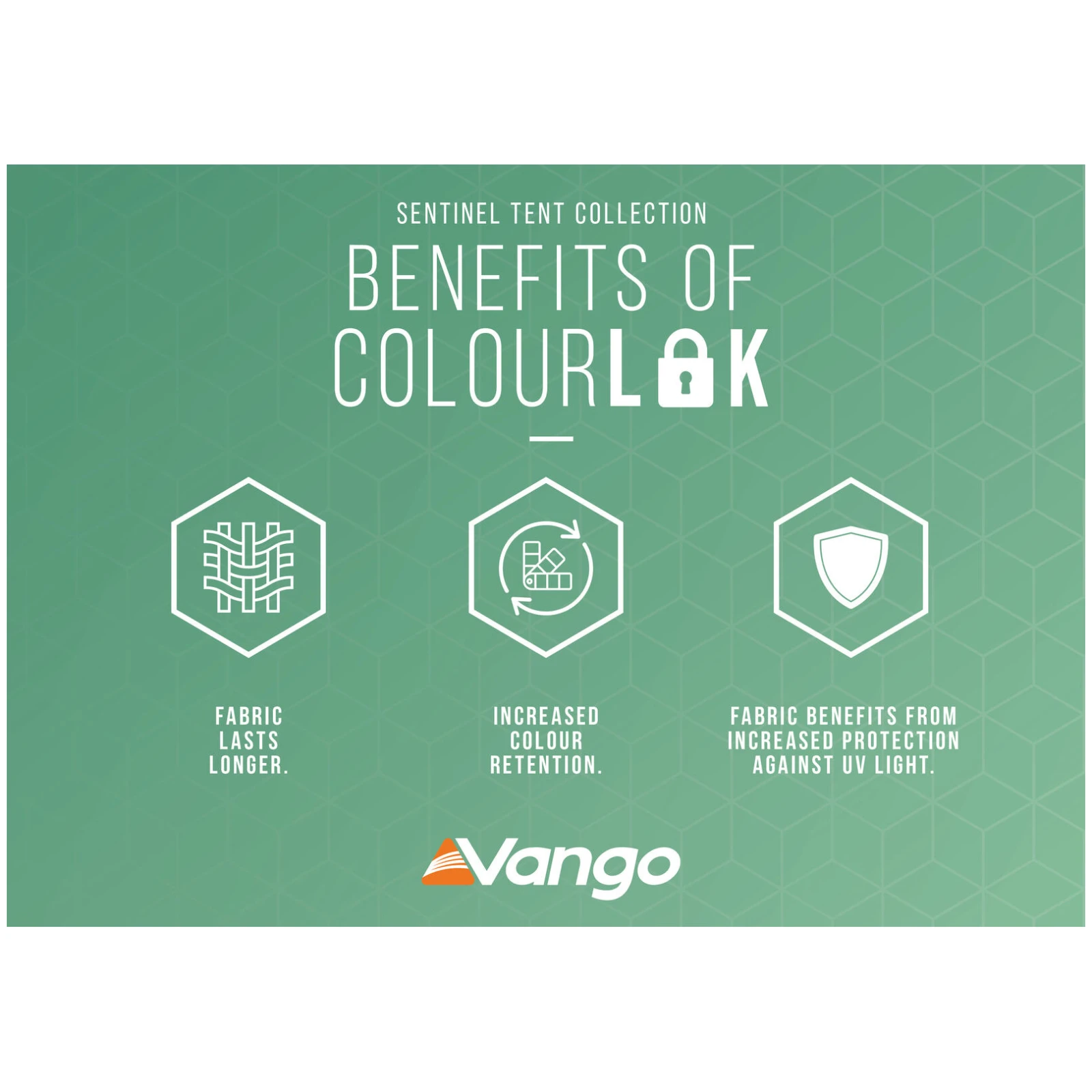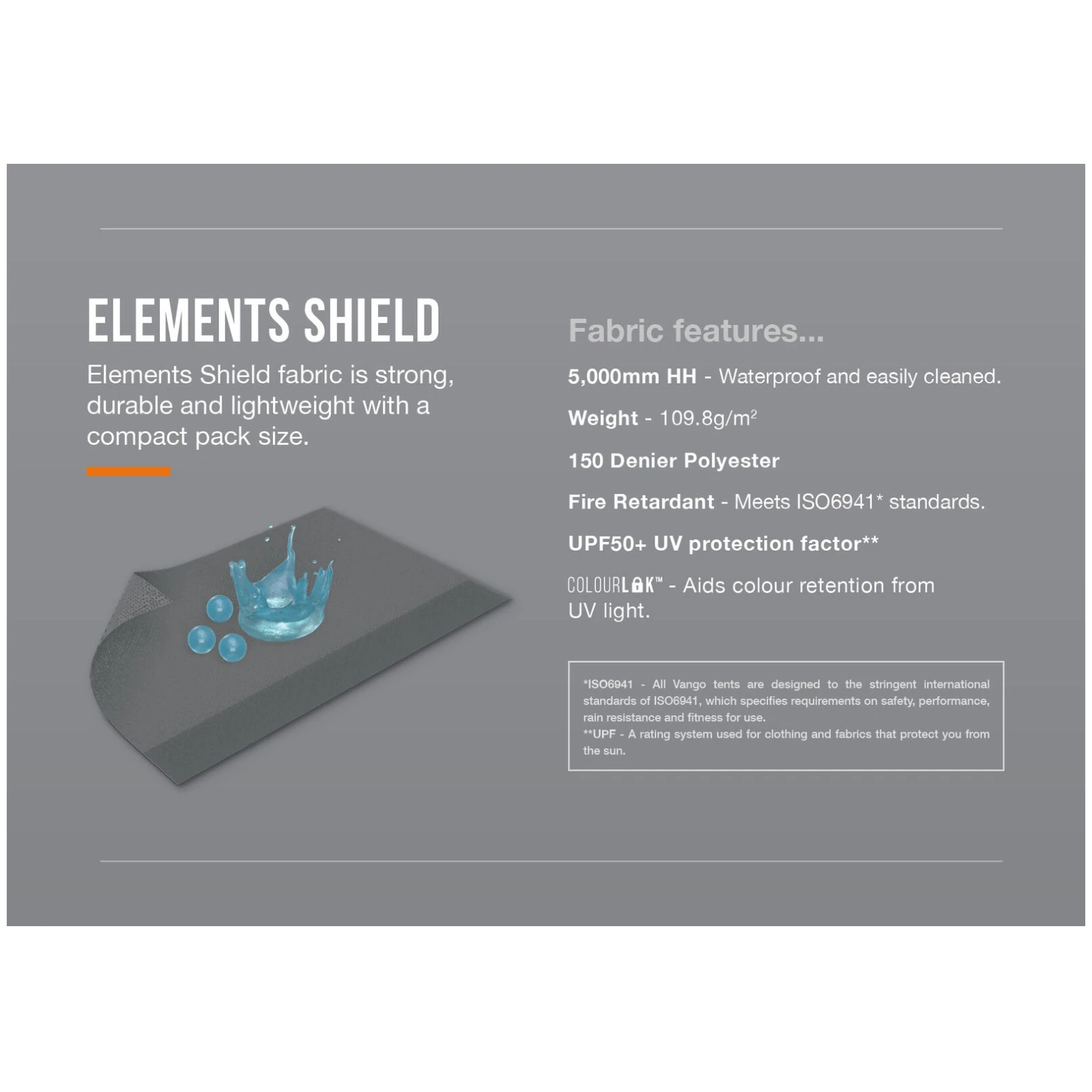 Lekka, a jednocześnie wytrzymała tkanina Elements Shield 150D o słupie wody 5 000 mm zapewnia niezawodną ochronę przed deszczem i niekorzystną pogodą, podczas gdy technologia ColourLok pomaga utrzymać kolory w stanie niezmienionym nawet przy częstym użytkowaniu. Duże okna Diamond Clear zapewniają doskonały widok na otoczenie i wystarczającą ilość światła dziennego, a zasłony na zamek umożliwiają łatwą regulację prywatności w zależności od potrzeb.