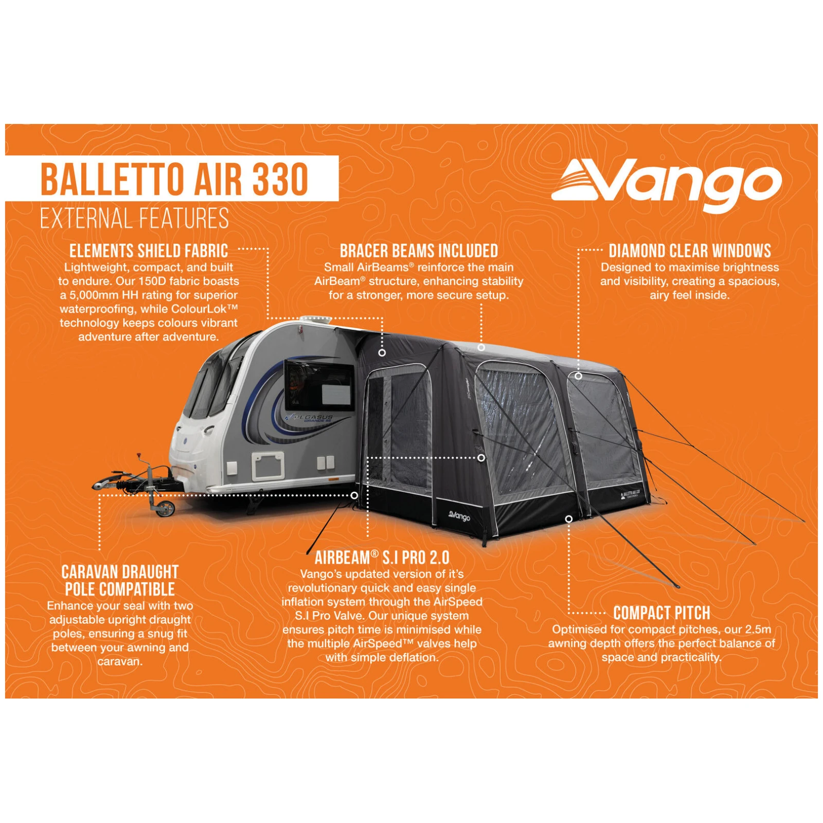 Przedsionek Balletto Air 330 od producenta Vango oferuje idealne zaplecze do odpoczynku, rodzinnych posiłków i praktycznego przechowywania podczas kempingu. Dzięki rewolucyjnemu systemowi nadmuchiwania jednym punktem i wielopunktowego spuszczania powietrza AirBeam®, jego rozstawienie i złożenie jest niezwykle szybkie i proste, dzięki czemu pozostanie Ci więcej czasu na samo korzystanie z urlopu.