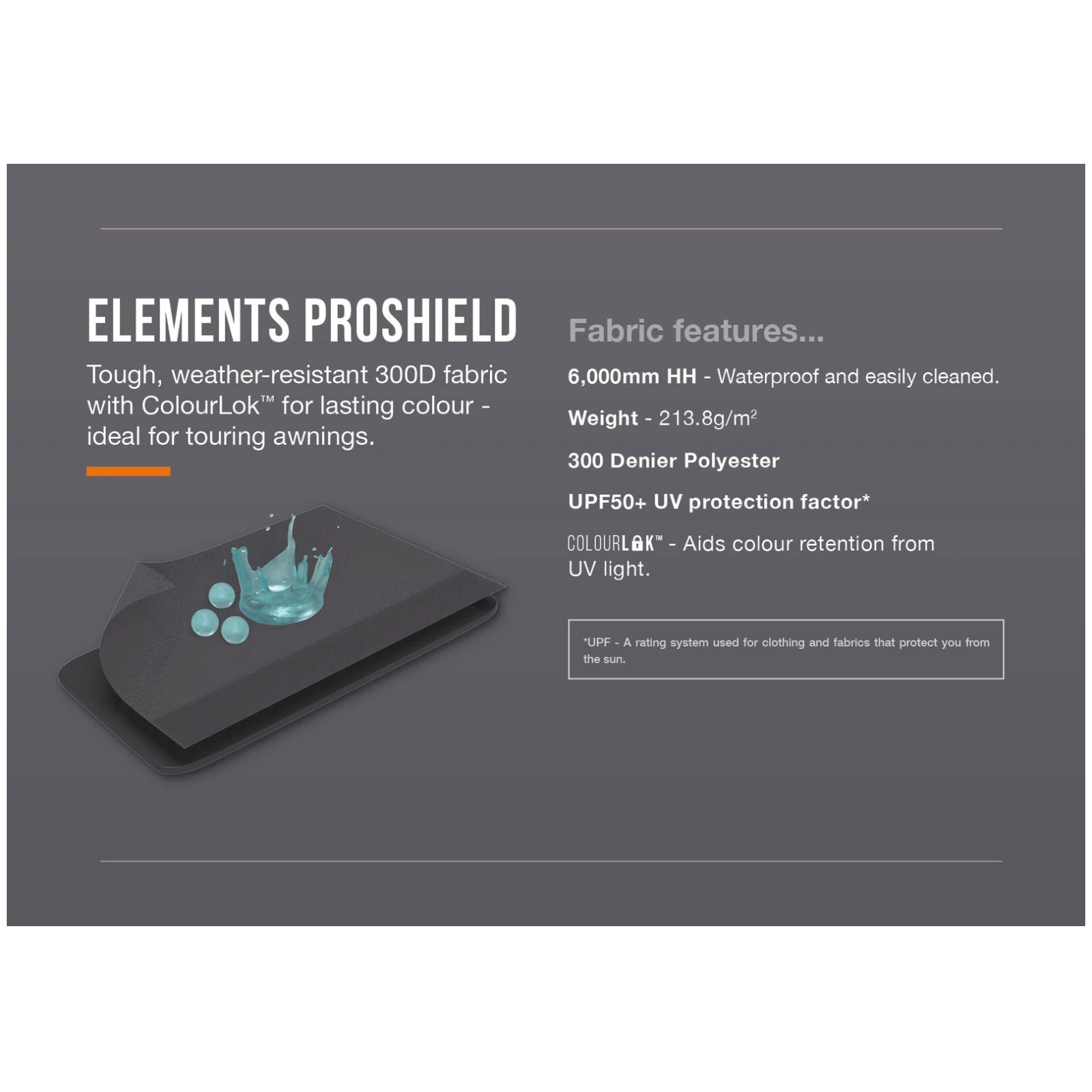Użyty materiał Elements ProShield o gęstości 300D oferuje wysoką odporność na warunki atmosferyczne i słup wody 6000 mm, dzięki czemu markiza może być niezawodna nawet przy niekorzystnej pogodzie. Technologia ColourLok™ pomaga utrzymać trwałość kolorów nawet przy długotrwałej ekspozycji na promieniowanie UV. Stabilność konstrukcji zapewniają wzmocnione belki SuperBeams, wstępnie wygięte wsporniki i wzmacniające belki AirBeams, które zwiększają wytrzymałość i odporność na wiatr.