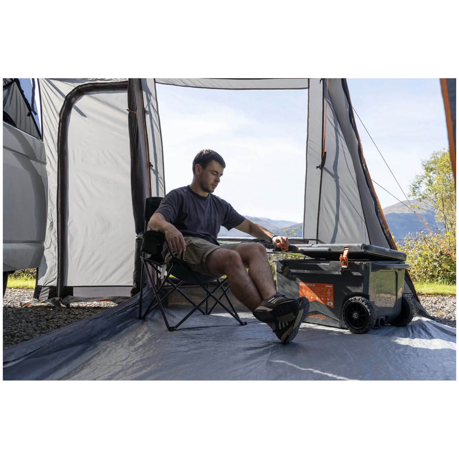 Przedsionek wyposażono w płaskie, łatwo dostępne wejście bez progu oraz przednie drzwi typu King Pole, które przy użyciu dodatkowych pałąków można przekształcić w daszek, idealny do wypoczynku lub spożywania posiłków na zewnątrz. Okna Diamond Clear zapewniają dużo światła dziennego i poczucie przestronności, podczas gdy regulowane zasłony - prywatność.