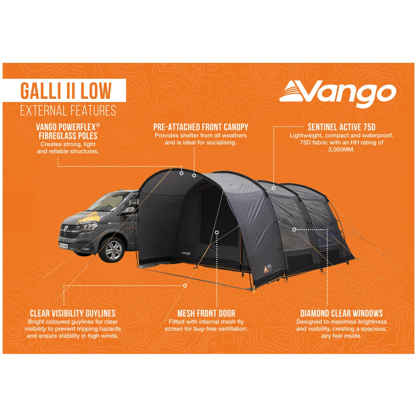 Lekka i wytrzymała tkanina Sentinel Active 75D o słupie wody 3000 mm oferuje niezawodną ochronę przed deszczem, zachowując przy tym bardzo niską wagę i kompaktowe wymiary po spakowaniu. Konstrukcja z prętów z włókna szklanego Vango PowerFlex® jest mocna, elastyczna i uzupełniona opatentowanym systemem TBSII, który znacząco zwiększa stabilność w wietrznych warunkach.