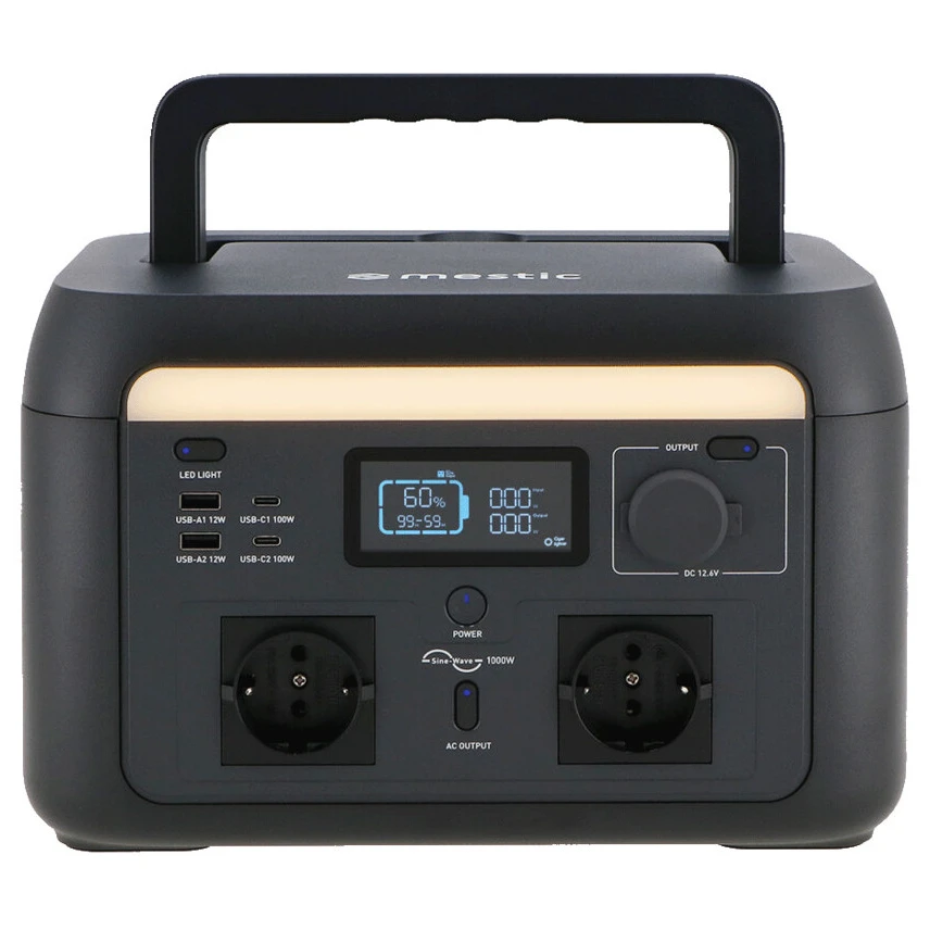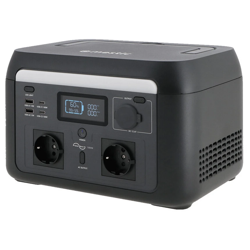 Przenośna stacja zasilania Mestic MPS-1000 oferuje wystarczającą ilość energii na wszystkie Twoje przygody z dala od sieci elektrycznej. Dzięki swojej mocy 1000 W (szczytowo do 1600 W) i pojemności 614 Wh poradzi sobie z zasilaniem wszystkiego, od świateł i laptopów po mniejsze urządzenia kuchenne. Dostępny jest szeroki zakres złączy wyjściowych – AC, DC, USB-A i USB-C – dzięki czemu podłączysz wszystkie popularne urządzenia. Dzięki wbudowanemu regulatorowi możesz bezpiecznie ładować przenośną stację zasilania panelem słonecznym i korzystać z odnawialnego źródła energii gdziekolwiek jesteś w podróży. Szybkie ładowanie zapewnia pełne naładowanie w zaledwie 75 minut. Pomimo swojej mocy urządzenie pozostaje łatwe do przenoszenia – waży zaledwie 8,5 kg. Wszystkim wygodnie sterujesz za pomocą aplikacji Mestic przez Bluetooth lub Wi-Fi.