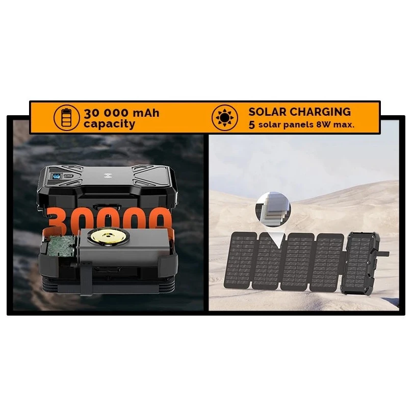 Wytrzymała konstrukcja z certyfikatem IP54 chroni urządzenie przed kurzem i zachlapaniem, natomiast wzmocniona konstrukcja gwarantuje odporność na wstrząsy nawet w trudnych warunkach. Powerbank jest wyposażony w akumulator litowo-polimerowy, który charakteryzuje się długą żywotnością i stabilną pracą. Zintegrowana bateria Lampa LED z trzema trybami oświetlenia (w tym SOS), wyświetlacz LED z dokładnym wskaźnikiem pozostałej pojemności oraz praktyczny uchwyt do zawieszania, który ułatwia korzystanie z ładowania słonecznego podczas przemieszczania się w terenie.
