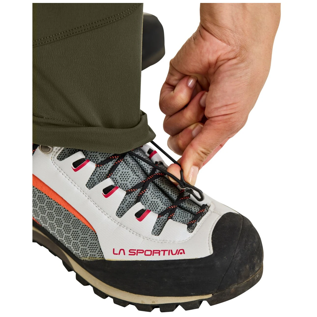 Wytrzymałe mankiety u dołu nogawek z metalowym haczykiem na sznurówki – idealna ochrona przed śniegiem i kamieniami