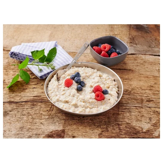 Śniadanie zbożowe marki Trek'n Eat o bardzo delikatnym smaku jabłek, dla zdrowego stylu życia. Żywność jest odwadniana przez liofilizację (lub zamrażanie). Proces ten usuwa wodę z żywności bez naruszania jej kształtu i zachowuje korzystne witaminy i minerały. Dzięki temu jedzenie jest znacznie lżejsze, ale zachowuje swoją pierwotną wartość odżywczą i smak.