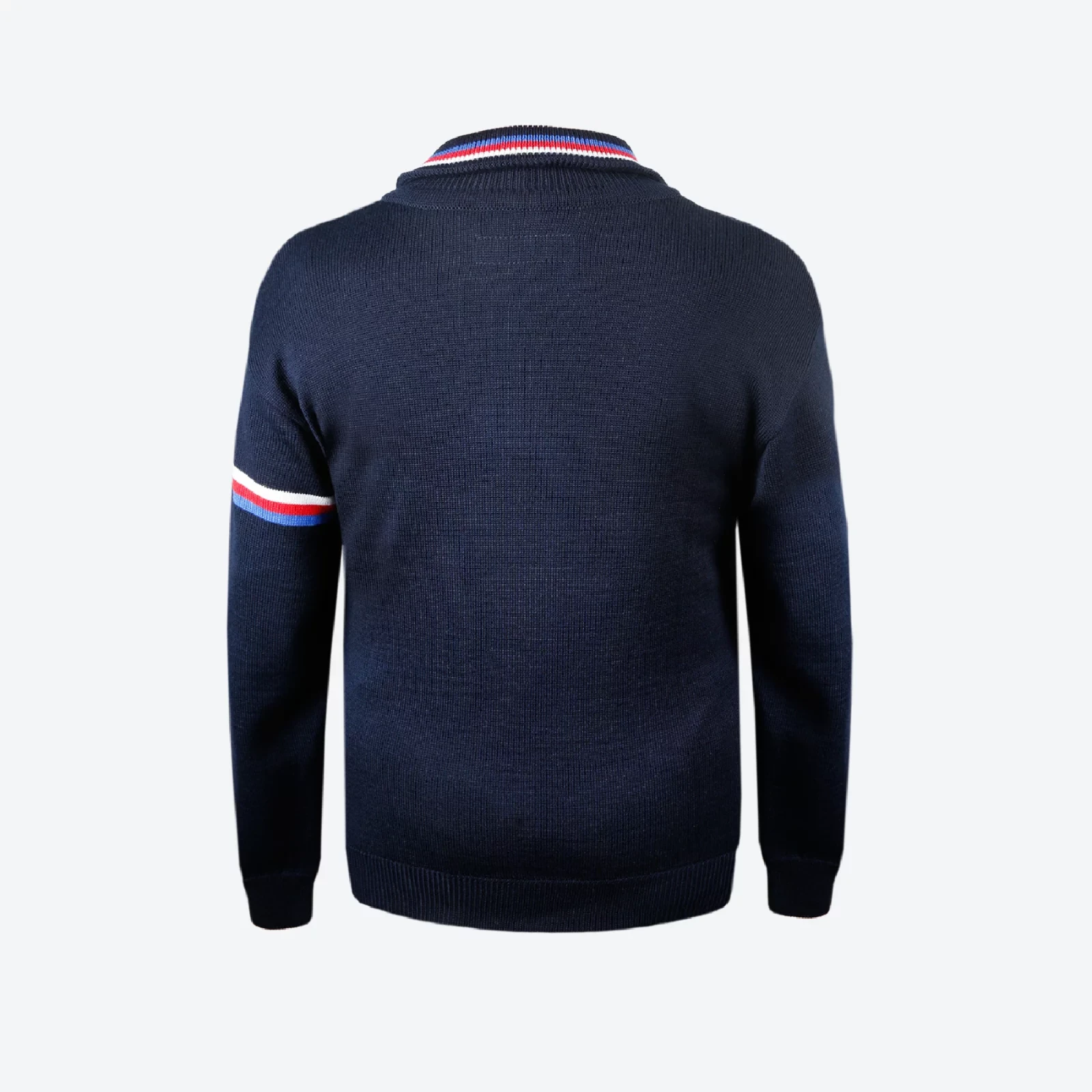Elegancki, jednokolorowy sweter z wysokiej jakości wełny Merino, uzupełniony subtelną trikolorą, to idealny wybór na co dzień.
