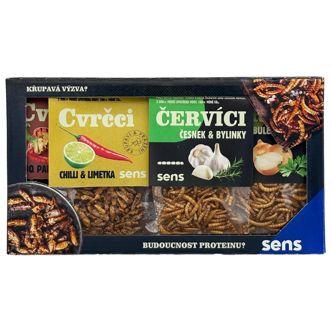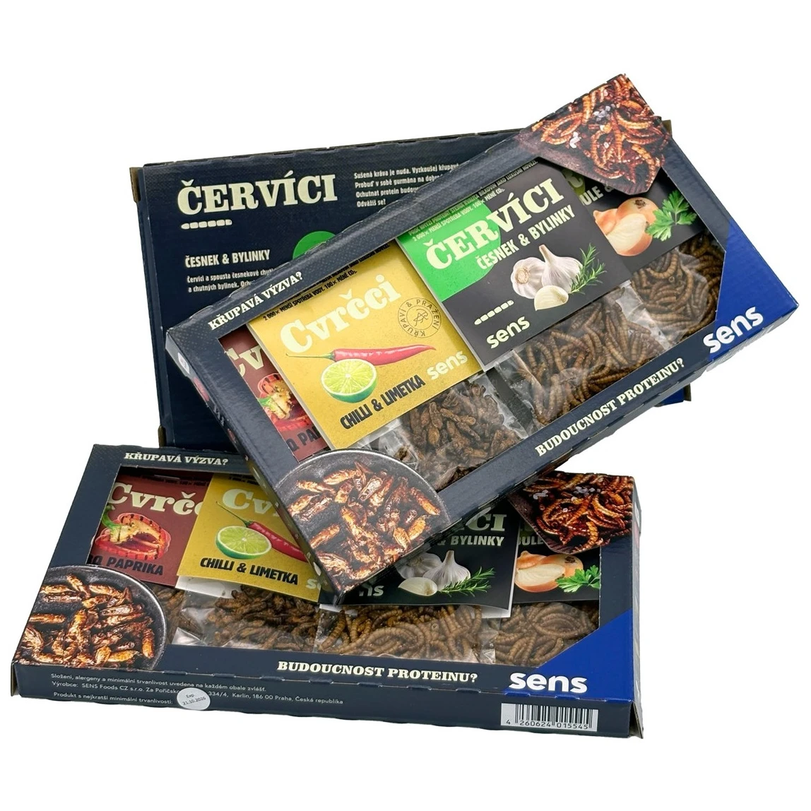 Pudełko zawiera dwie paczki chrupiących świerszczy w smakach Chilli & limonka i papryka BBQ oraz dwie paczki prażonych mączników w smakach czosnek & zioła i cebula & pietruszka.