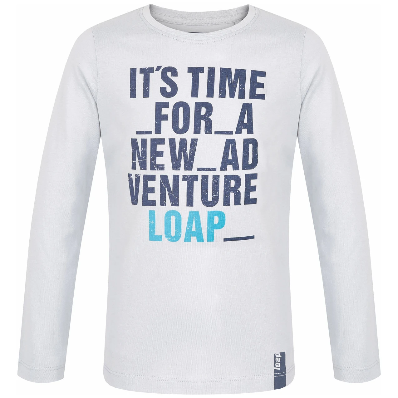 Przyjemna bawełniana koszulka chłopięca Loap Binos ma długi rękaw i okrągły dekolt. Zdobiony wyrazistym, matowym napisem