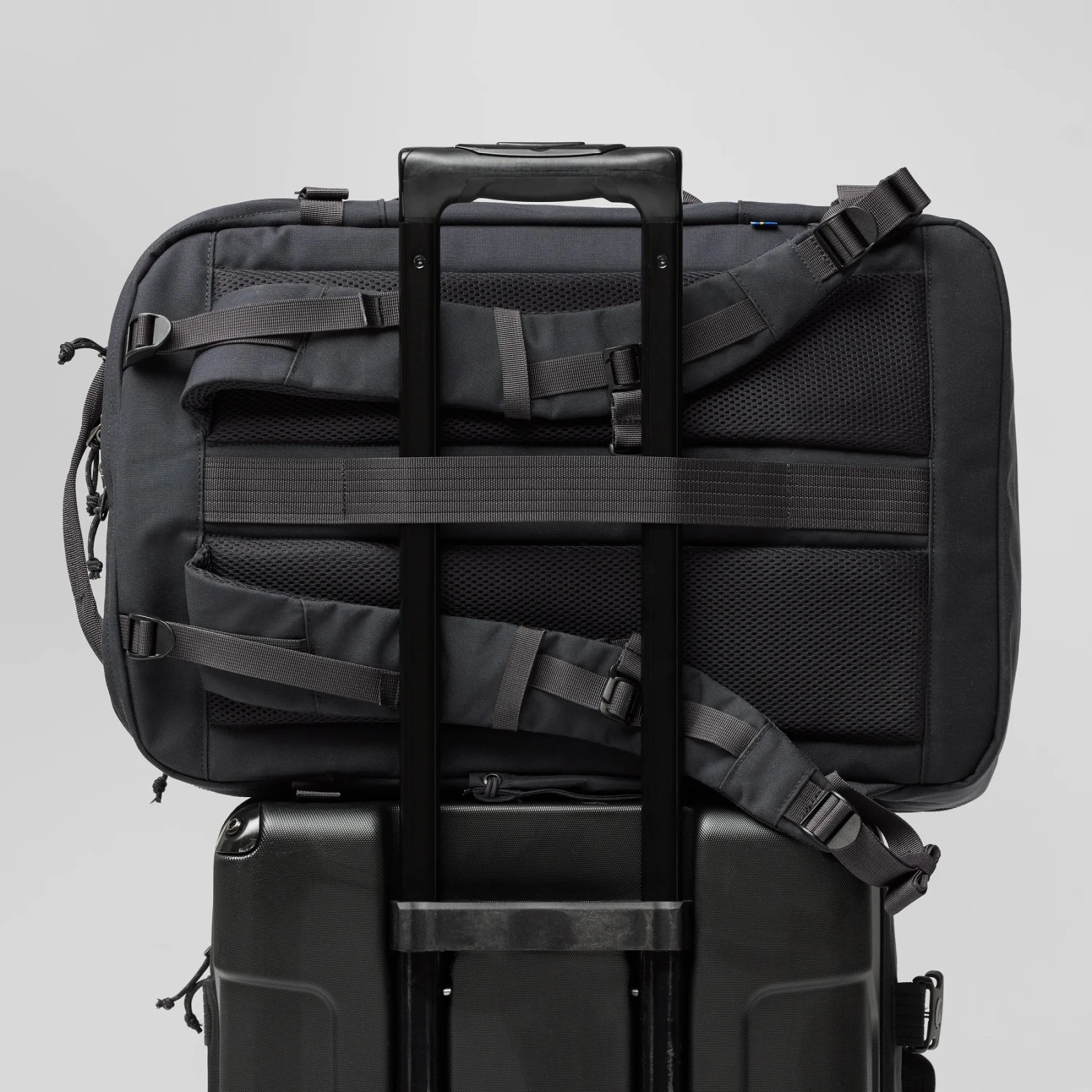 - Tylny pasek umożliwiający przymocowanie plecaka do rączki innego bagażu