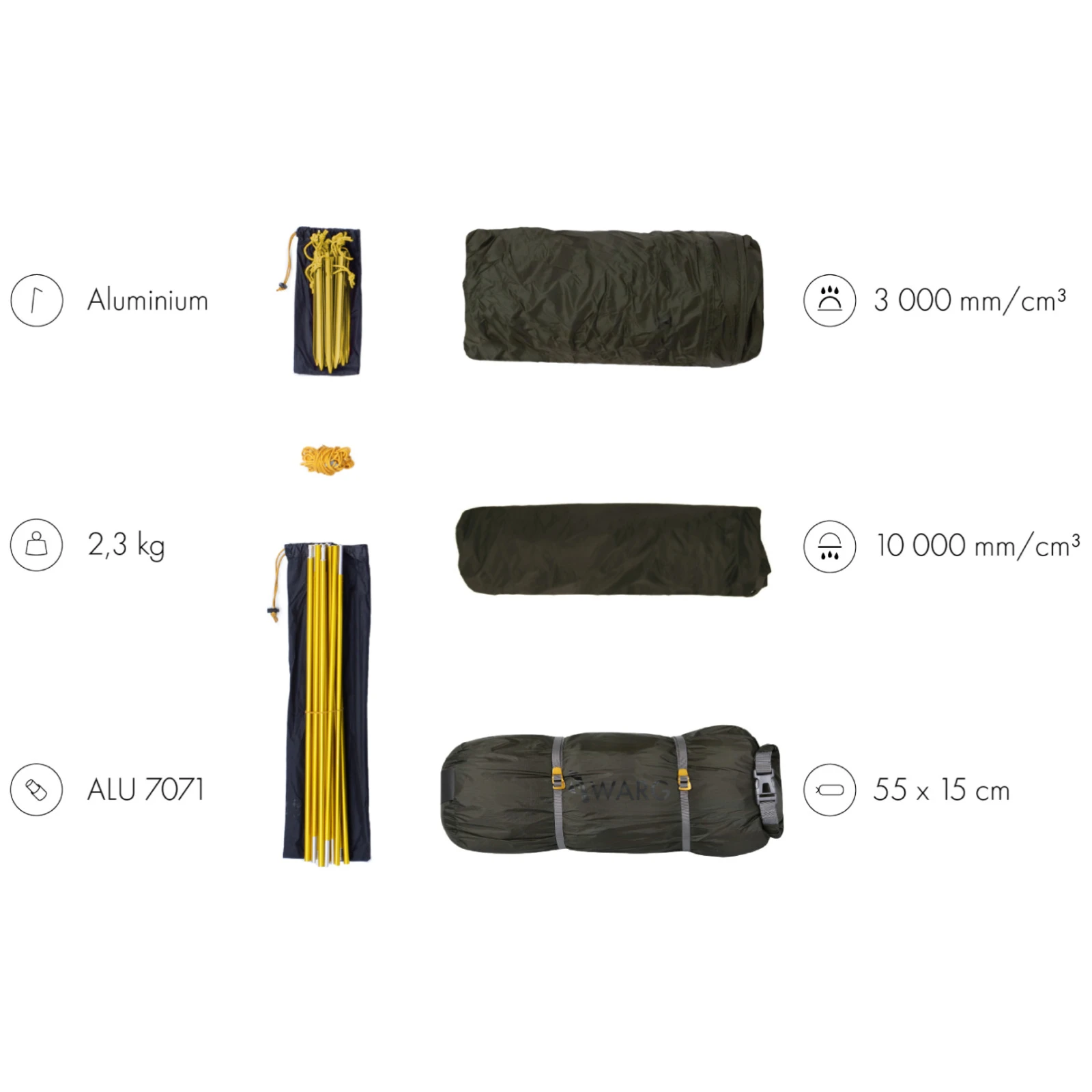Ultralekki namiot turystyczny Warg Atak 3 jest przeznaczony dla trzech osób, a dzięki przemyślanej konstrukcji duraluminiowej jest to najlżejszy samonośny namiot dla trzech osób marki Warg. Niska waga została osiągnięta dzięki nylonowemu tropikowi z silikonową powłoką, który jest lżejszy, mocniejszy i bardziej odporny na ścieranie niż poliester. Doskonałą stabilność i odporność na wiatr zapewnia zastosowanie pojedynczego elementu nośnego i jego rozgałęzienie na trzy podelementy.
