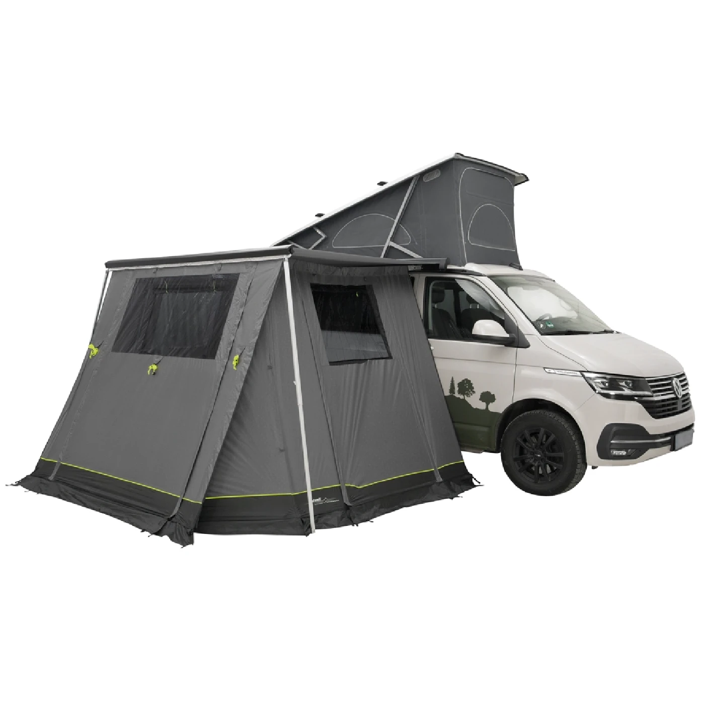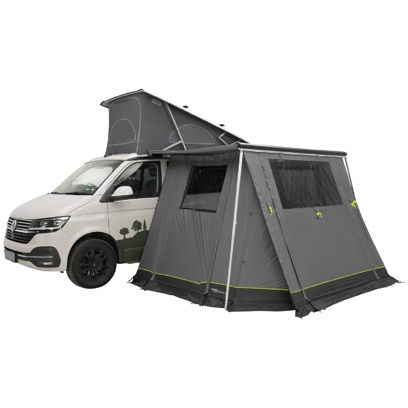 Przymocujesz bezpośrednio do markizy za pomocą listew kedrowych o szerokości 5 i 7 mm. Powłoka schronienia wykonana jest z wodoodpornego materiału Outtex® 4000 Select, który chroni nawet podczas złej pogody. Ściany boczne posiadają duże przyciemniane okna, które odpowiednio oświetlają wnętrze przedsionka, jednocześnie zapewniając prywatność dzięki zasłonom. Wstępnie zamontowane odblaskowe liny utrzymają plandekę na miejscu nawet w trudnych warunkach pogodowych. Przedsionek jest łatwy do spakowania i wygodnie mieści się w tylnych drzwiach Californii.