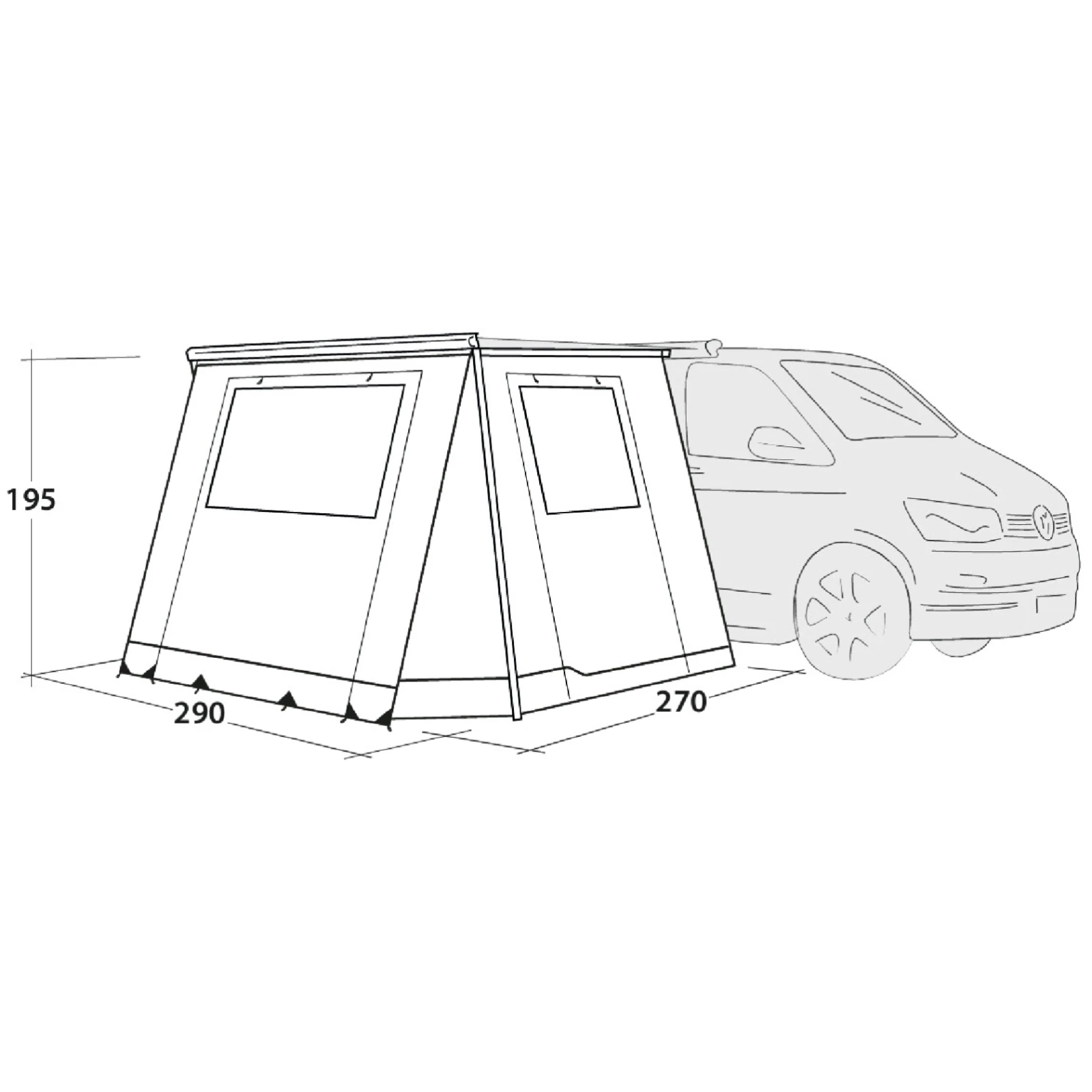 Odpowiednie dla markiz o wymiarach 260/270x200 cm: Thule 5200, Thule 5102, Thule Sidehill, Fiamma F43 Van, Fiamma F45s, Fiamma F45 VW T5/T6, Fiamma F45 PSA, Dometic PW1100 i Dometic PW1500. Idealny dla kamperów typu VW T5/T6/T6.1 (Multivan, Caravelle, Transporter, California), MB W639/W447 (Klasa V, Vito, Marco Polo) itp.