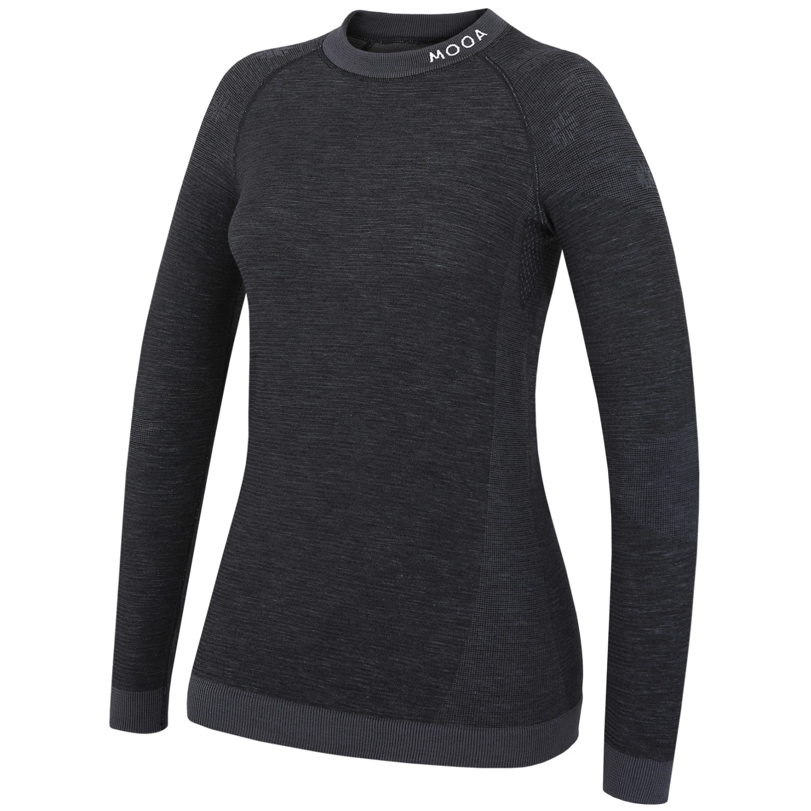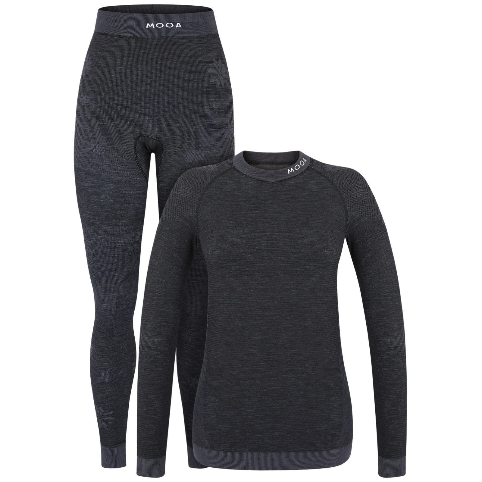 MOOA Merino Seamless to damski zestaw funkcyjny zaprojektowany jako pierwsza warstwa do aktywnego ruchu i całodziennego noszenia, łączący koszulkę z długim rękawem i kalesony w jeden technicznie dopasowany komplet. Obie części wykorzystują połączenie wełny merino i włókien syntetycznych, dzięki czemu oferują wysoki komfort, elastyczność i niezawodną funkcjonalność podczas aktywnego ruchu i całodziennego noszenia. Bardzo elastyczny materiał doskonale dopasowuje się do kształtu ciała i przyjemnie je otula.