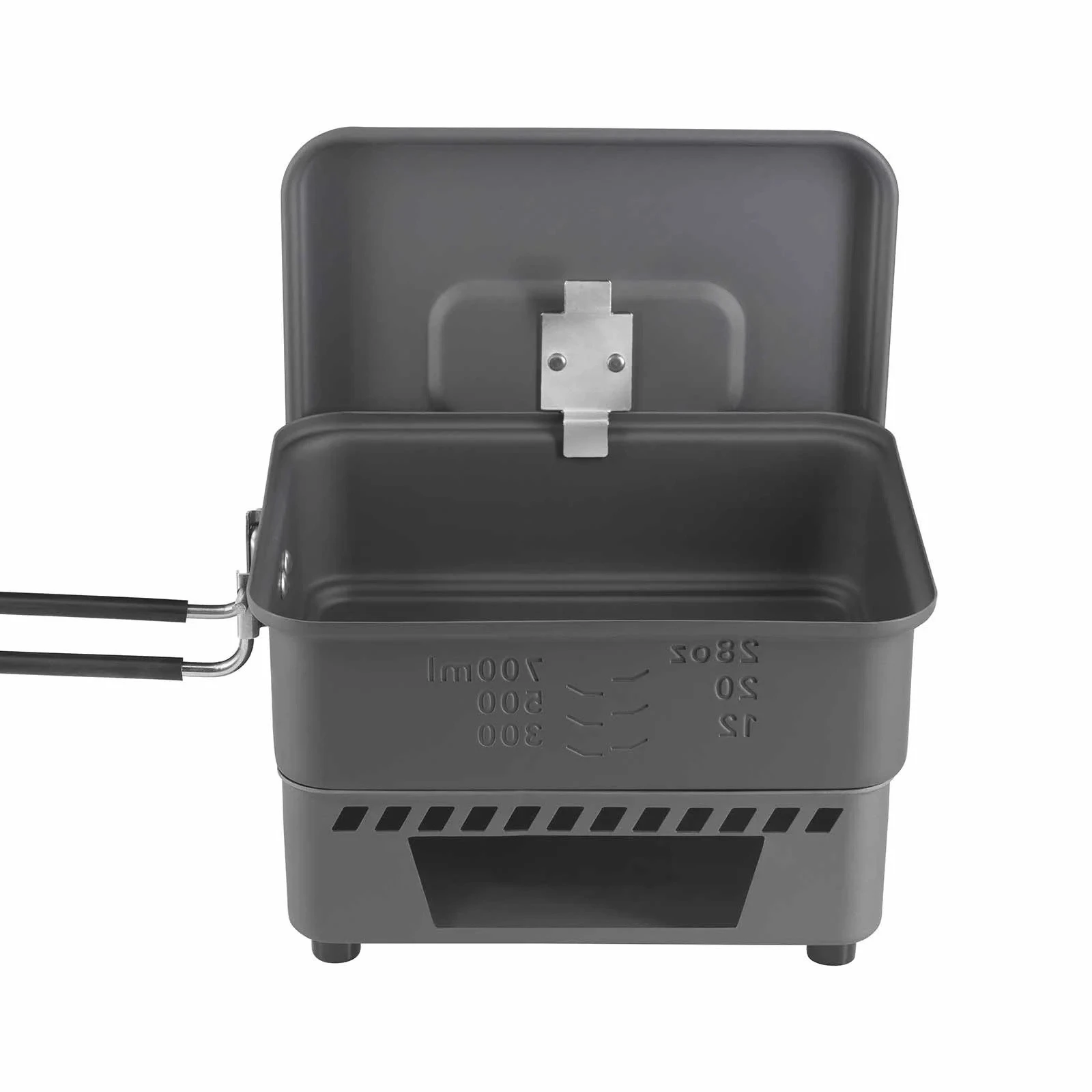 Pojemnik o pojemności 1,1 litra wykonany jest z hartowanego aluminium anodowanego, które oferuje niską wagę i dobrą wytrzymałość w zastosowaniach outdoorowych. Praktyczna miarka w ml i oz ułatwia gotowanie, a składana rączka z silikonowym pokryciem zapewnia bezpieczne użytkowanie nawet w wyższych temperaturach.