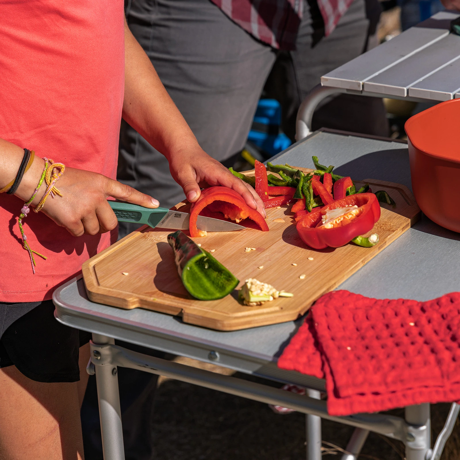 deska do krojenia Zestaw Gerber Compleat Cutting Board Zestaw zawiera dwie dwustronne deski do krojenia wykonane z bambusa i polipropylenu, nóż do obierania 8,25 cm, nóż szefa kuchni 15 cm i tackę do przechowywania. Kiedy przychodzi czas na spakowanie obozu, wszystko jest kompaktowe.
