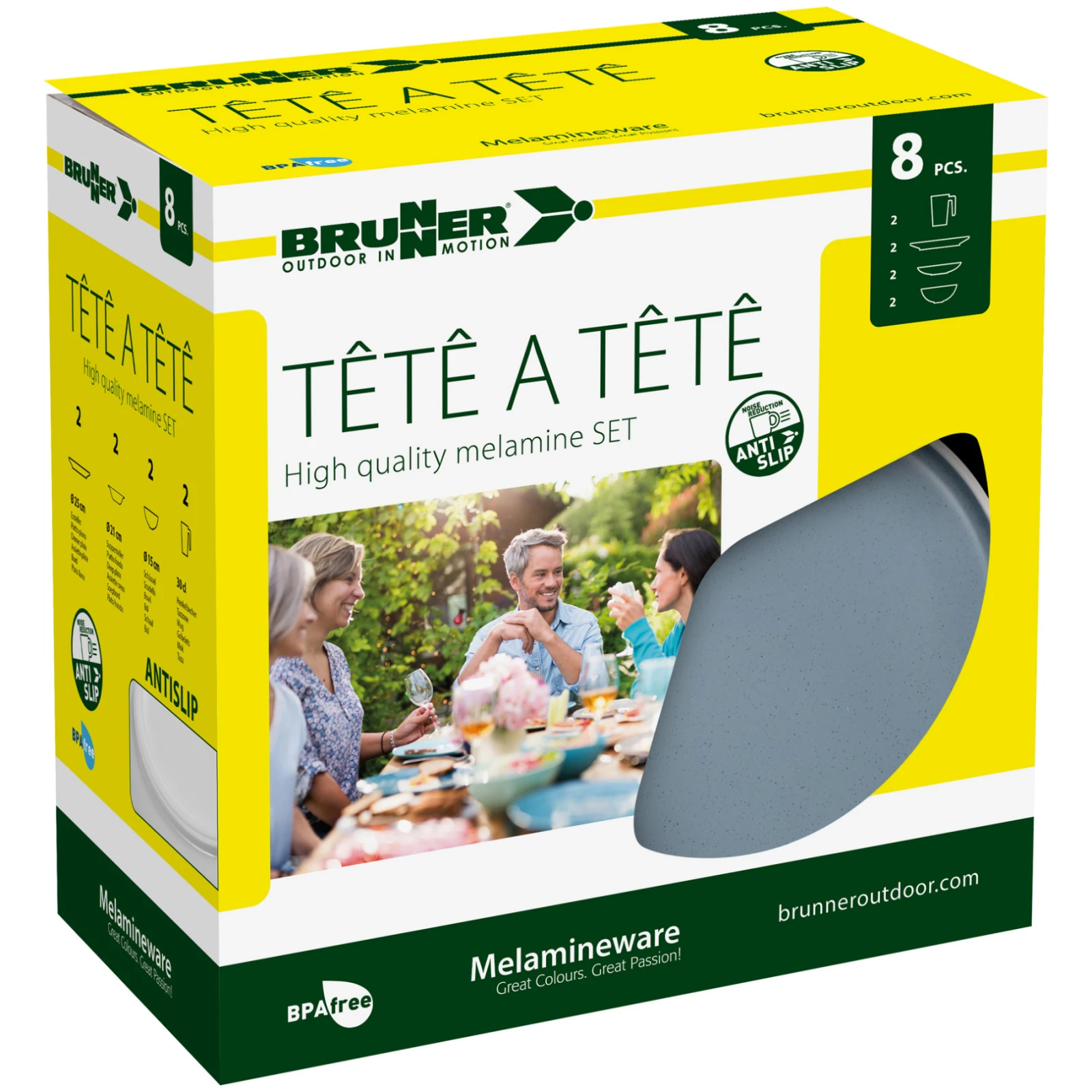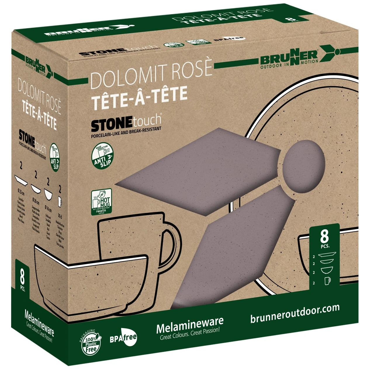 zestaw Zestaw naczyń Dolomite Zestaw tete-a-tete firmy Brunner zawiera niezbędny sprzęt kempingowy. Zestaw składa się z 8 elementów i jest odpowiedni dla 2 osób. Na kempingu docenisz zwiększoną trwałość dzięki zastosowaniu melaminy. Materiał ten jest odporny na uderzenia, łatwy w czyszczeniu, odporny na ciepło i wilgoć, bezwonny i bezsmakowy oraz przyjazny dla środowiska. Naczynia można wkładać do zamrażarki i myć w zmywarce.