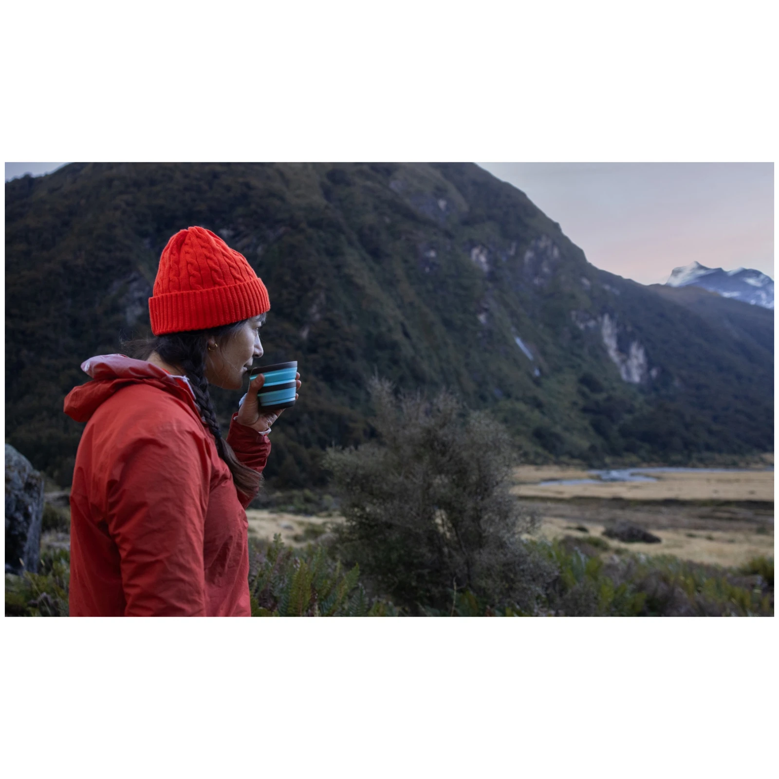 Nowa, lekka konstrukcja tego zestawu przekłada się na jeszcze niższą wagę. Każda miska jest teraz wyposażona w rant ułatwiający jej trzymanie. Oprócz górnej krawędzi posiada także środkowy pas, który ułatwia chwyt w przypadku gorących płynów. Każdy element zestawu składa się do wysokości około 2 cm, a kubek i miska pasują do siebie, co pozwala na wyjątkowo kompaktowe spakowanie.