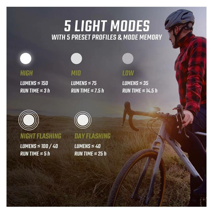 - przednia lampka Buster 150: 150 lumenów, zasięg 74 m, 5 trybów (High/Mid/Low/Day & Night Flashing), żywotność do 25 h