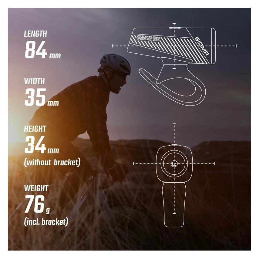 Zestaw lampek Sigma Buster 150 + Nyte 10 łączy mocne światło przednie o strumieniu świetlnym 150 lumenów i zasięgu do 74 metrów z lekkim i wytrzymałym światłem tylnym widocznym z 500 metrów. Przednia lampka Buster 150 oferuje 5 trybów świecenia, pamięć ostatniego ustawienia i do 25 godzin świecenia. W trybie High lampka Buster 150 osiąga strumień świetlny 150 lumenów przez maksymalnie 3 godziny, w trybie Mid świeci do 7,5 godziny przy strumieniu świetlnym 75 lumenów. A jeśli wycieczka się przedłuży, w trybie Low niezawodnie świeci do 14,5 godziny.